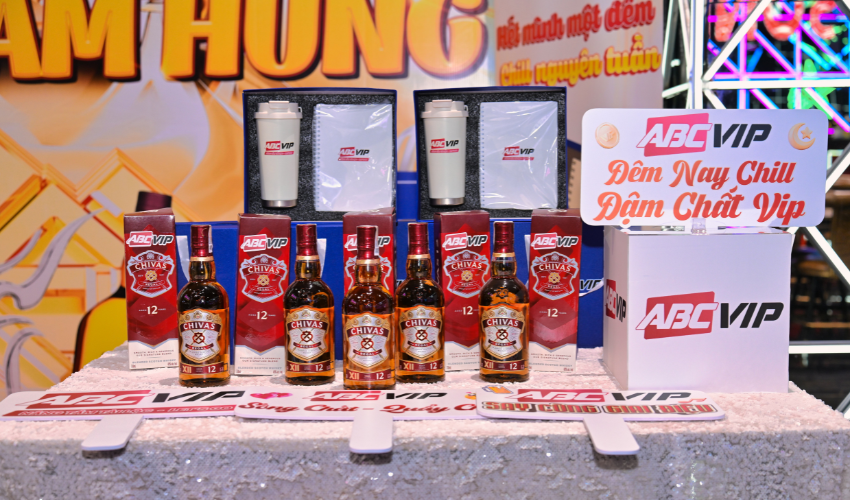 ABCVIP đã khiến người tham dự không khỏi bất ngờ khi trao tận tay những phần quà đậm chất VIP: 7 Set quà độc quyền bao gồm: Ly giữ nhiệt ABCVIP cao cấp và Sổ tay thương hiệu sang trọng, được thiết kế riêng cho sự kiện, tinh tế từ hình thức đến chất lượng. 5 chai Chivas 12 biểu tượng của sự lịch lãm, mạnh mẽ và tinh thần kết nối đỉnh cao.